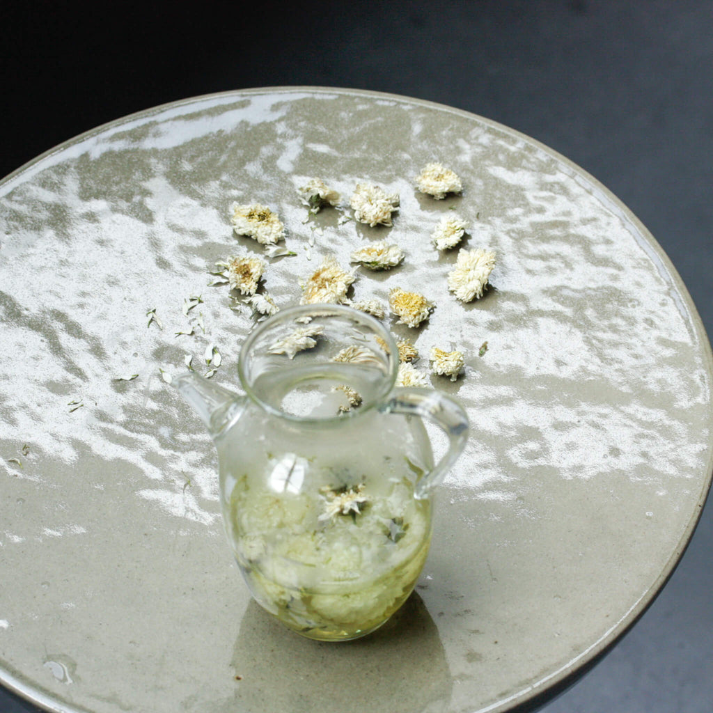 Sinds we naar Europa zijn gekomen, hebben we zijn tegenhanger hier leren kennen: Kamillebloemen. We moeten zeggen dat als we na tien jaar hier wonen onze Chrysanthemum opnieuw bekijken, we ons realiseren waarom het thuis zo veel werd gedronken. In plaats van theezakjes wordt onze Chrysanthemum geserveerd met de hele theebloem, een zen-moment voor het oog. Het heeft niet de zeer sterke kruiden/medicinale/oude smaak die je zou verwachten nadat je hier bekend bent geraakt met kamillethee. In plaats daarvan zijn er lichte hints van munt, witte thee en een zoete nasmaak.