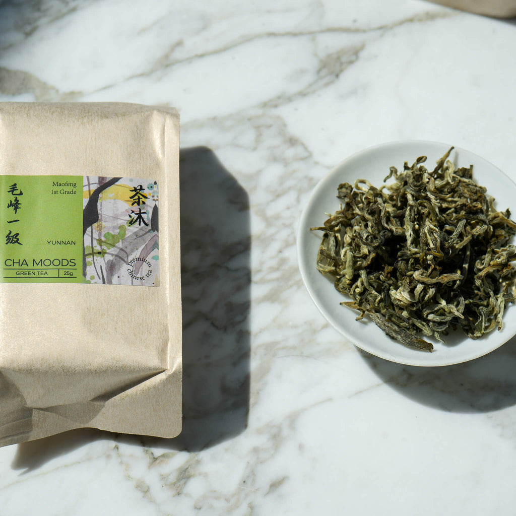 Maofeng green tea brings you the essence of spring. The shape of the finished tea is delicate and flat, with a few sharp edges, and the color is light and smooth green. Best brewed in a glass cup, where you see the mist around the rim and the leaves standing and swaying inside. A great choice if you are looking to recharge in the middle of a working day.