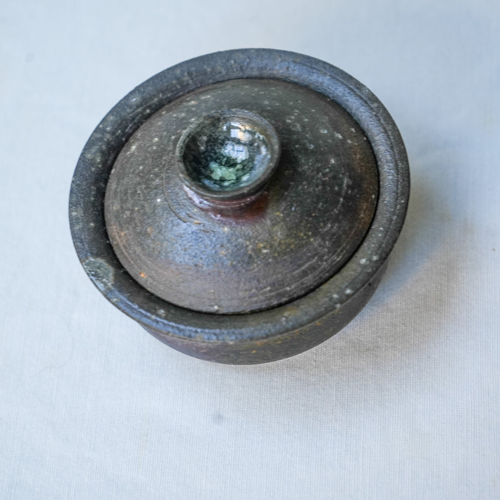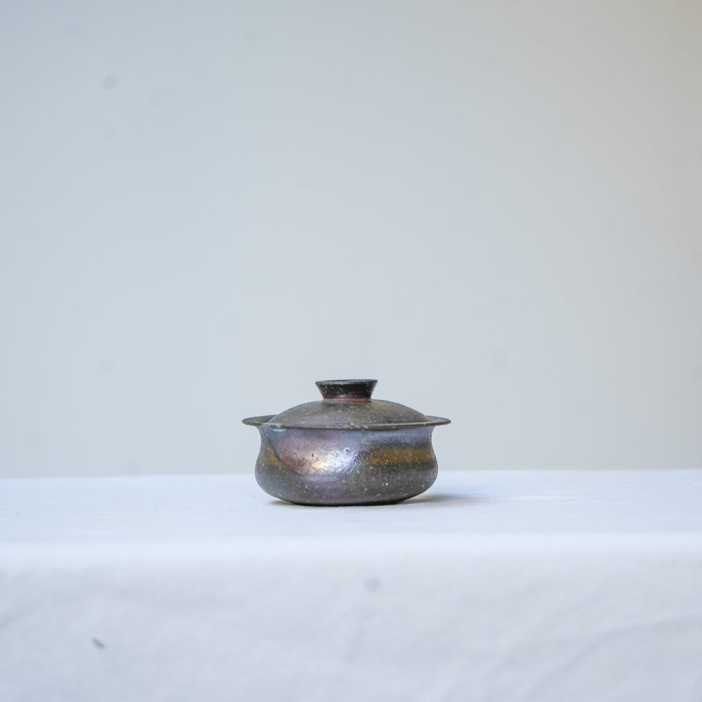 A low, rounded wood-fired gaiwan with a quiet, smoky surface. The Jingdezhen clay Red Pearl (红珍珠) body shows natural fire gradients—deep charcoal shifting into soft plum and bronze tones. Subtle ash deposits create a metallic sheen across the lid and shoulder. Which seasons well and will attain colorful metallic shine when used often.