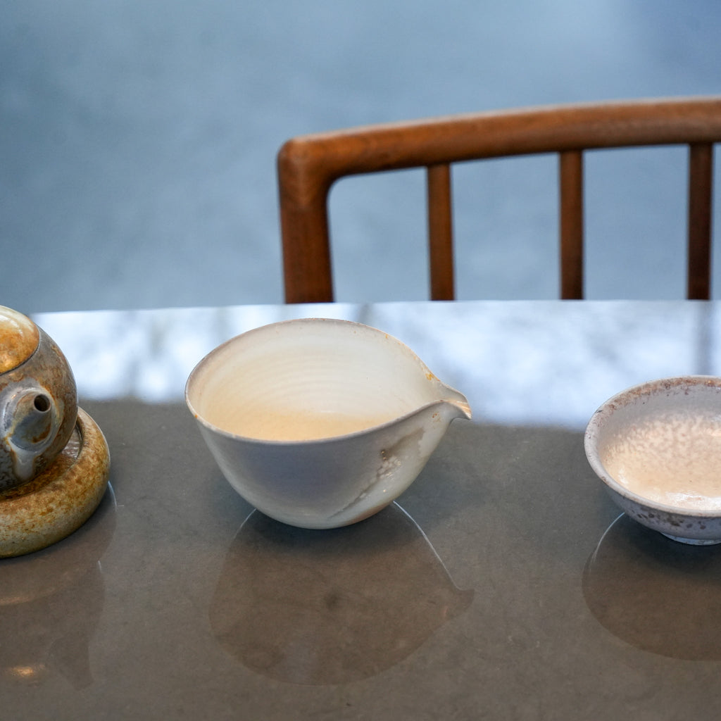 A 'Gao Bai Ni' (High White Porcelain Clay from Jingdezhen' fairness cup that shines the oura of the elegance of porcelain with the random touch of wood firing. The spout is smooth and light, made for gentle pouring.